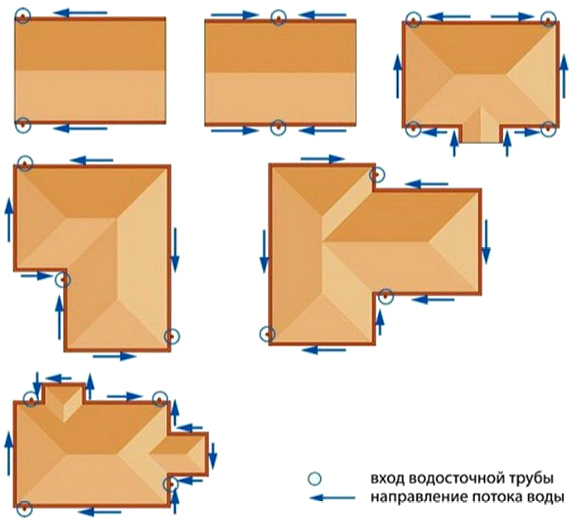 Dans les structures à pignon, à plusieurs pentes et à plusieurs pentes, plusieurs lignes de gouttières distinctes sont installées. Des canaux de drainage verticaux sont placés au centre du mur ou aux coins de la maison.