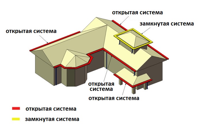 Le système le plus populaire pour les maisons privées est la variété organisée en plein air. Cette option convient aux toits cassés, à pignon, en tente, en hanche. Pour l'élimination ultérieure de l'humidité bien filtrer ou égout pluvial.