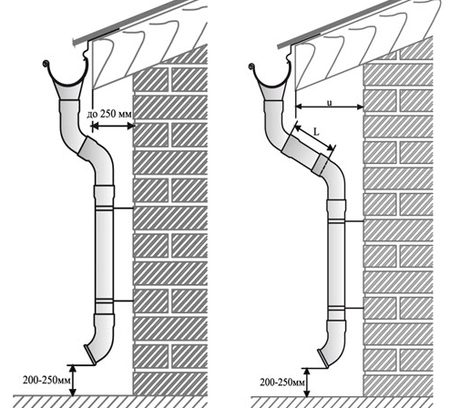 Montez ensuite les éléments supplémentaires, connectez les virages verticaux et horizontaux l'un à l'autre, définissez la marque inférieure. Dans les régions à fortes précipitations hivernales, il est souhaitable d'équiper le système de drainage circuit de chauffage, les instructions d'installation sont décrites dans notre article recommandé.