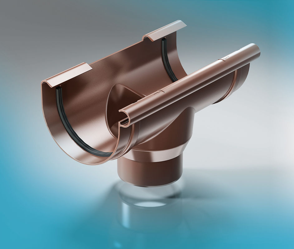 Connecteur de gouttière - une bande semi-circulaire avec pinces et loquets. L'élément est utilisé pour ancrer les gouttières en ligne continue. Un joint en caoutchouc est nécessaire pour sceller le joint.