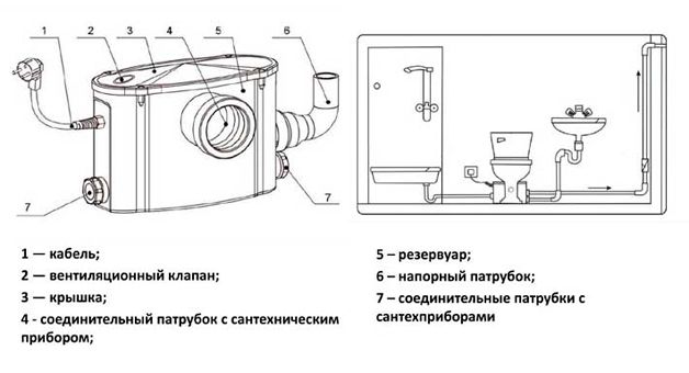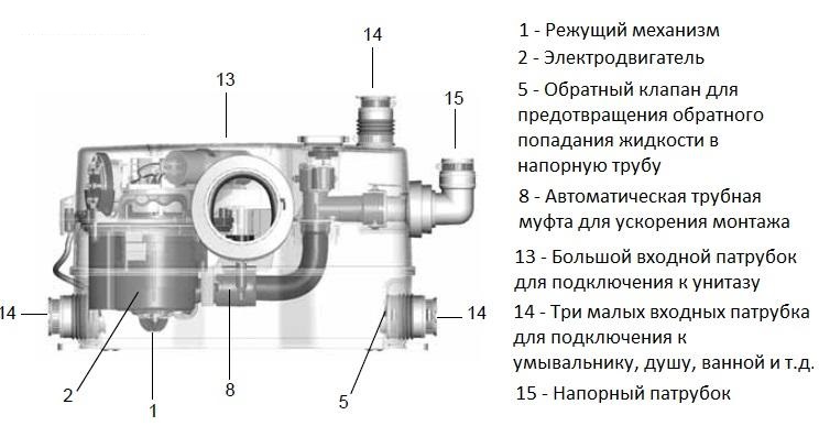 - Pompe fécale. Deux pompes sont installées dans les stations de travail quotidiennes: une pompe de travail et une de secours, dont la tâche est d'élever les eaux usées à un certain niveau pour leur poursuite dans les canalisations par gravité.