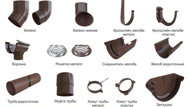 Les capuchons de gouttière sont installés aux extrémités des lignes de gouttière, ont une variété de configurations et de formes (droitier, gaucher, universel). En raison des contours, une installation soignée des tuyaux est réalisée sur des sites architecturaux complexes. Les tés fournissent des taches techniques et les entonnoirs, les filets et les grilles contribuent à l'élimination efficace de l'eau.