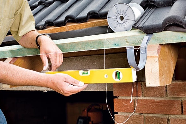 Lors de la création d'une galerie de supports, il est nécessaire de prendre en compte la pente vers l'entonnoir préfabriqué du tuyau de drainage. Pour ce faire, en tenant compte de la pente spécifiée, les supports de gouttière initiale et finale sont montés et le cordon de commande est tiré entre eux.