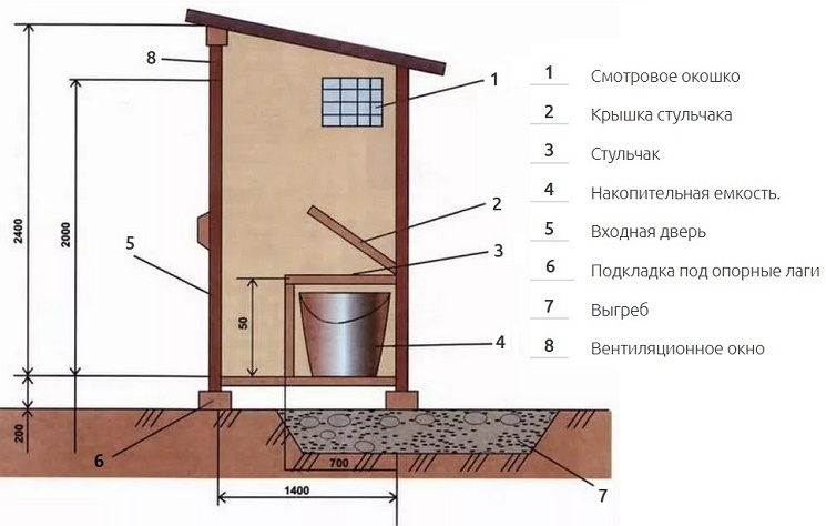 L'une des options, présentée par un dessin standard d'une toilette de campagne d'une série de cabanes, s'élève de 2,5 à 3 mètres de hauteur et couvre une superficie de 1,2 (2,00) x 1,0 (1,5 m) sur la base.