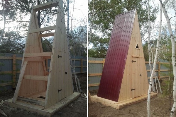 Equipez-les de housses (pour la partie WC + siège avec trou). Le matériau de toiture est posé sur le toit en pente de la cabane. Faites la porte dans le plan du mur avant. Sur ce montage peut être considéré comme terminé.