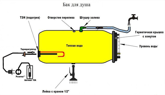 Le dispositif de douche pour une résidence d'été, qui est généralement installé près du mur de la maison ou à une certaine distance du bâtiment, est assez simple. Habituellement, cela se résume à un ensemble de "réservoir volumétrique + arrosoir de grue". Le réservoir est monté sur le toit d'une structure légère, et l'arrosoir ne doit pas être plus haut qu'à distance d'un bras tendu.
