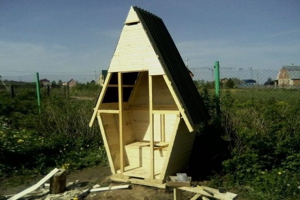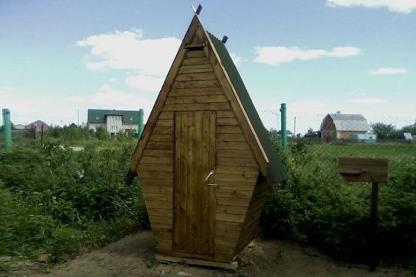 Le cadre du classique "Birdhouse" est en bois. Comme la peau, vous pouvez utiliser différents matériaux. Le toit de la cabine peut être à une ou deux pentes. Un stand sera construit au-dessus de la fosse à déchets.