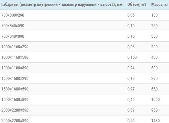 Les anneaux en béton sont disponibles en différentes tailles sur le marché. La hauteur des produits est toujours la même et est de 90 cm, mais le diamètre peut varier de 70 à 200 cm.