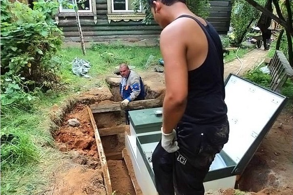 Dans le pays, les parents avaient des problèmes constants avec les égouts, l'eau gargouillait, tout coulait mal, il y avait une stagnation d'eau. En général, ne lavez pas la vaisselle, ne faites rien. J'ai décidé de leur donner une fosse septique Astra pour 3 personnes. Les travailleurs ont creusé un trou sous la station, nivelé et percuté le fond. Après avoir immergé la station dans la fosse, ils ont aspergé de sable de tous côtés, avant de remplir le réservoir d'eau pour qu'il n'y ait pas de pression sur la coque.