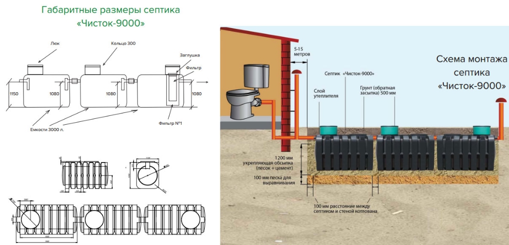 Pour compléter la revue de la ligne, nous analyserons les caractéristiques techniques du modèle le plus volumineux - une fosse septique Chistok-9000composé de trois réservoirs.