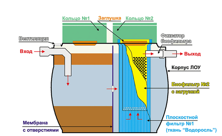 Comparé au Shar, le Chistok-2000 a une conception plus complexe. En raison de la charge accrue, la deuxième chambre est équipée de deux types de filtres - des "collerettes" en polymère et des bandes de tissu. Le double traitement des eaux usées offre un traitement plus efficace.