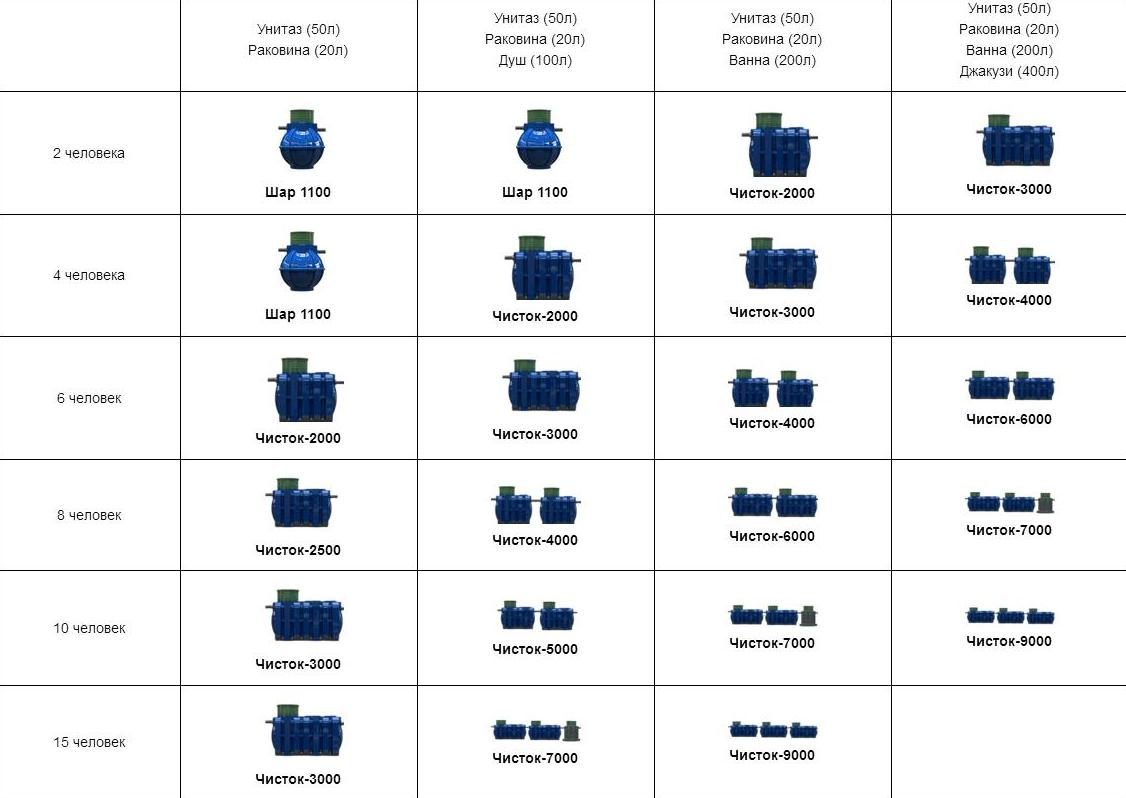 Le choix d'une station d'épuration dépend de son volume et de sa productivité. Pour éviter aux utilisateurs de perdre du temps à calculer, le fabricant a analysé des facteurs importants - le nombre de personnes vivant en permanence et la présence de points de rejet des eaux usées - et a compilé un tableau pratique.