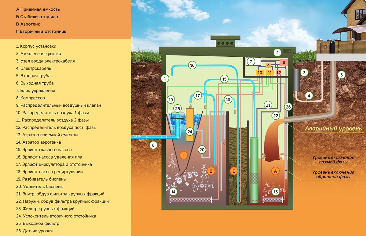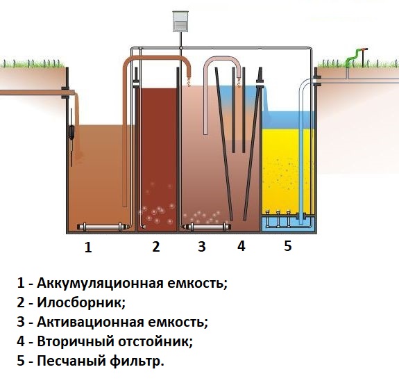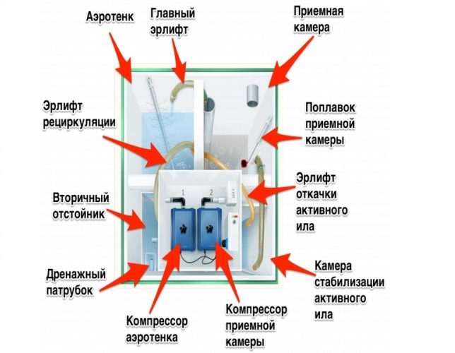 À l'intérieur, il est divisé en quatre sections fonctionnelles. Il y a un dispositif intégré pour l'entrée d'air de la surface pour s'assurer que les effluents sont saturés d'oxygène.