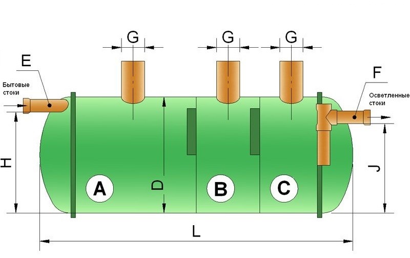 À l'extérieur, la fosse septique «Flotenk» est un conteneur cylindrique installé horizontalement ou verticalement. À l'intérieur, la cavité de l'appareil est divisée en deux ou trois sections de tailles différentes.