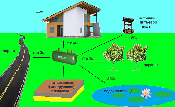 Pour ce faire, à distance de la fosse septique, une série de tranchées ou une fosse sont creusées, au fond desquelles un filtre à sable-gravier est disposé. Il comprend des couches de sable, de gravier et de gravier. Tout d'abord, une couche de remblai filtrant gravier-sable est déposée dans les tranchées, au-dessus desquelles se trouve un système de tuyaux perforés - drains.