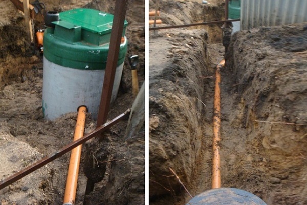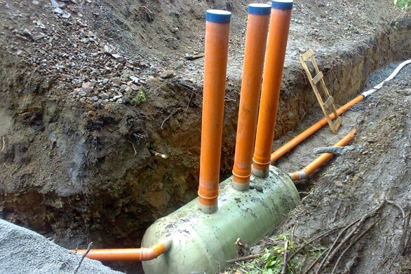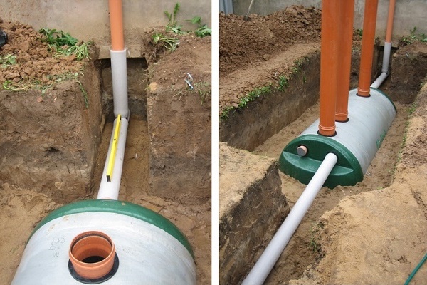 Tout d'abord, le sol est rempli jusqu'au niveau auquel les tuyaux d'égout et de filtration sont connectés à la fosse septique. Connectez ensuite ces tuyaux. Au-dessus de chaque compartiment de la fosse septique, il y a un canal de service. Ils devraient porter des prises spéciales.