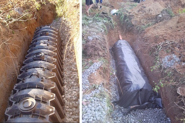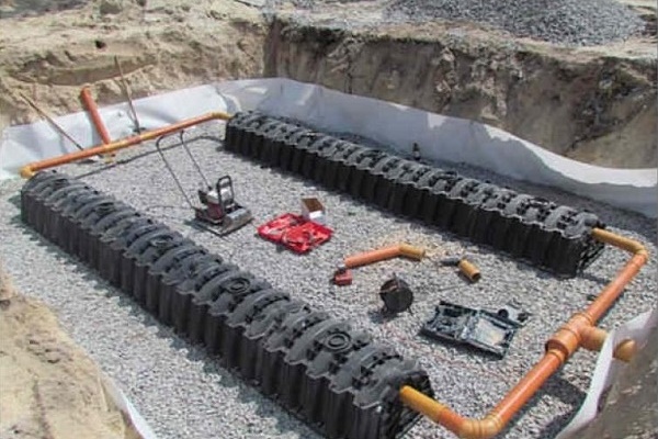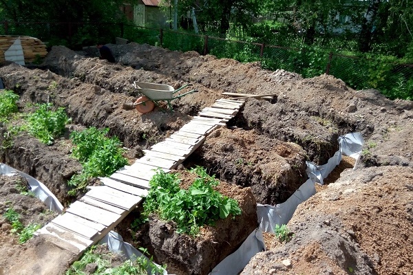 Une fois la fosse prête, vous pouvez vous occuper de la création d'un champ de filtration. Il s'agit d'une série de tranchées parallèles avec un filtre posé à l'intérieur et des tuyaux perforés. L'eau purifiée de la fosse septique s'écoulera par des tuyaux et s'infiltrera progressivement dans le sol à travers un filtre.