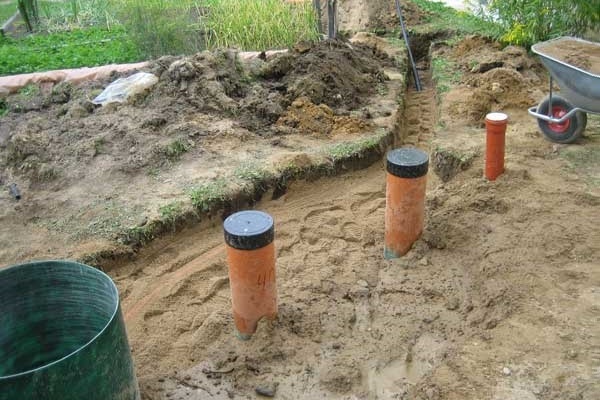 Avec un niveau d'eau souterraine de 1,2 mètre et plus profond et un type de sol incohérent sableux, il est utilisé champ de filtre. C'est le nom du kit, qui comprend les pipelines de distribution et d'irrigation.