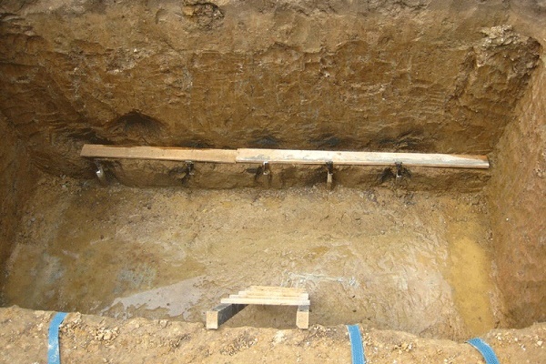 Pour installer la fosse septique elle-même, vous devez creuser une fosse. Les paramètres de la sole de la fosse de 60 cm doivent dépasser les dimensions correspondantes du fond de la fosse septique. Il est souhaitable que le fond de la fosse soit strictement horizontal. L'écart admissible n'est que de 10 mm par mètre.