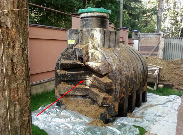 Je peux joindre une photo de la fosse septique, que nous avons dû réinstaller, après l'auto-installation par l'un des résidents d'été. Vous pouvez remarquer que le cadre est sérieusement déformé du côté de la pression au sol. Il est bon qu'il n'y ait pas de fissures et il a été possible d'aligner la structure.