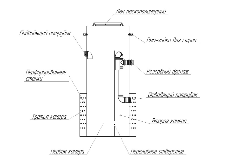 Ils ressemblent à un cylindre avec un col, un couvercle et un fond conique. Deux tuyaux sont disposés sur les côtés: pour connecter les tuyaux d'égout. Selon l'un d'eux, l'effluent entre dans la station d'épuration, le second se déplace après traitement dans le domaine de la filtration, un infiltrateur, bien absorbé ou gouttière.