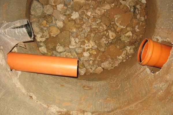 Une tranchée pour le tuyau d'égout menant de la maison à la fosse septique sans pompage et sans odeur est posée avec une légère pente. À la jonction de la fosse septique et du tuyau, un trou de taille appropriée est pratiqué dans l'épaisseur du béton.
