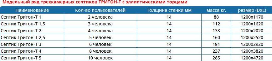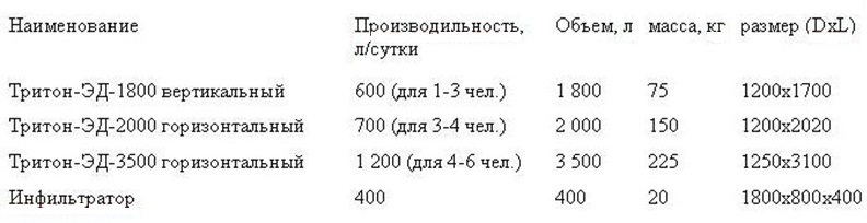 Une analyse plus détaillée des caractéristiques techniques des fosses septiques vous permettra d'obtenir une image complète de chaque modèle Triton séparément. Faites attention à la variété des conceptions, du volume, des performances et des caractéristiques d'installation.