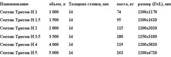 Contrairement aux fosses septiques à deux chambres, Triton N Il n'a pas de sortie de vidange, c'est donc un réservoir de stockage habituel. Cependant, la demande pour des conceptions de ce type est grande, de sorte que le fabricant a développé une gamme assez étendue de modèles qui diffèrent en volume - de 1 000 litres à 60 000 litres.