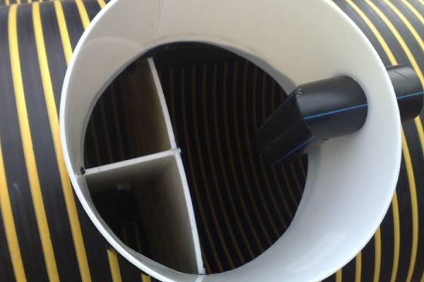 La graisse flotte à la surface et forme un film qui doit être retiré périodiquement s'il n'est pas installé pièges à graisse d'égout. Par la suite, l'eau passe le post-traitement dans la chambre aérée et sur le champ de filtration.