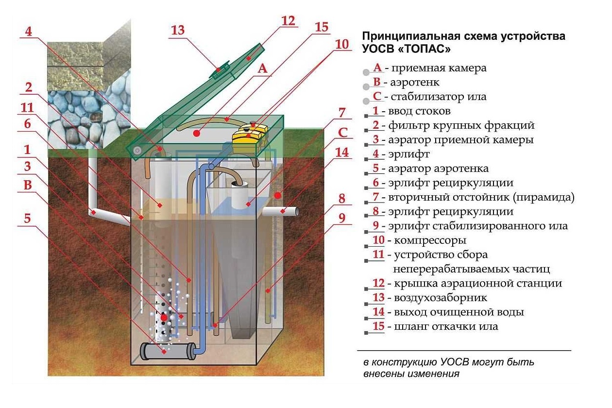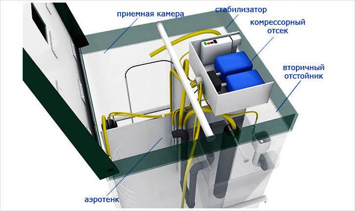 Le travail d'un appareil apparemment complexe est basé sur le processus naturel de décomposition biologique. L'essentiel est d'assurer un approvisionnement continu en oxygène et de saturer les eaux usées avec une forte dose de boues activées, nécessaire à l'oxydation intensive des substances organiques.