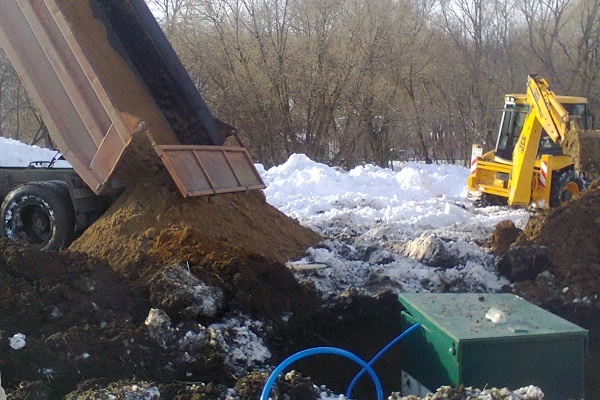 Pour amener les réseaux d'égouts, un fossé est creusé, ce qui assurera le passage de la canalisation en dessous du point de congélation du sol.