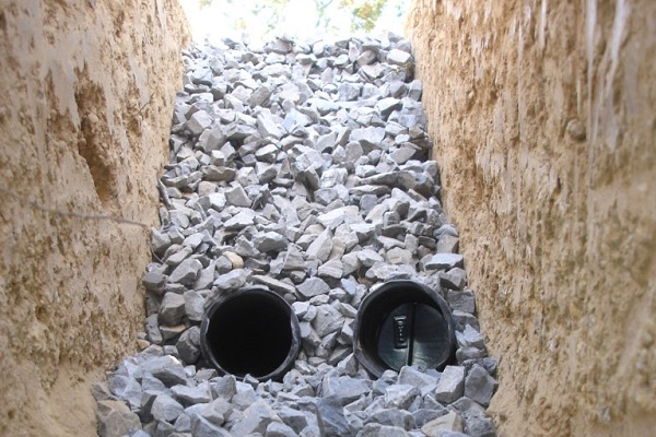 L'eau sédimentée dans la fosse septique pénètre dans le pipeline supérieur, s'infiltre à travers la perforation et passe après traitement à travers la pierre concassée et le sable. Ensuite, les eaux usées traversant le filtre naturel du sol sont collectées par le tuyau de drainage sous-jacent - draene, à travers lequel elles sont évacuées vers le site d'élimination.