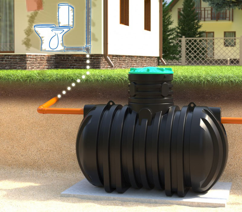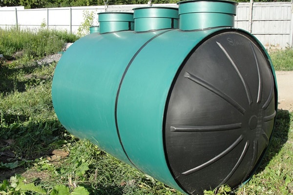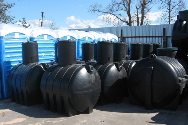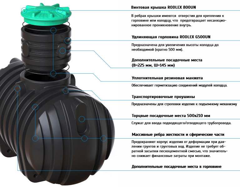 Réservoir de stockage Rodlex en polymère par rotomoulage. La capacité de coulée solide est équipée de cols et de couvercles allongés (diamètre de la trappe - 80 cm). La fosse septique est utilisée comme puisard.