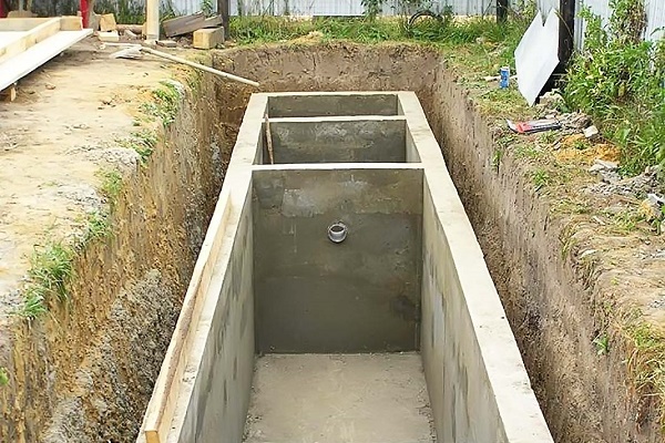 La fosse septique est divisée par des cloisons. Le mouvement du fluide entre eux s'effectue par des tuyaux de trop-plein.