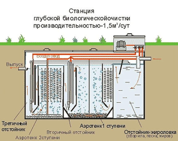 - Système de ventilation. Quelles que soient les bactéries (anaérobies ou aérobies) impliquées dans le traitement des eaux usées, l'échange d'air est nécessaire au fonctionnement normal des micro-organismes, à l'élimination du méthane et au maintien de la température souhaitée.