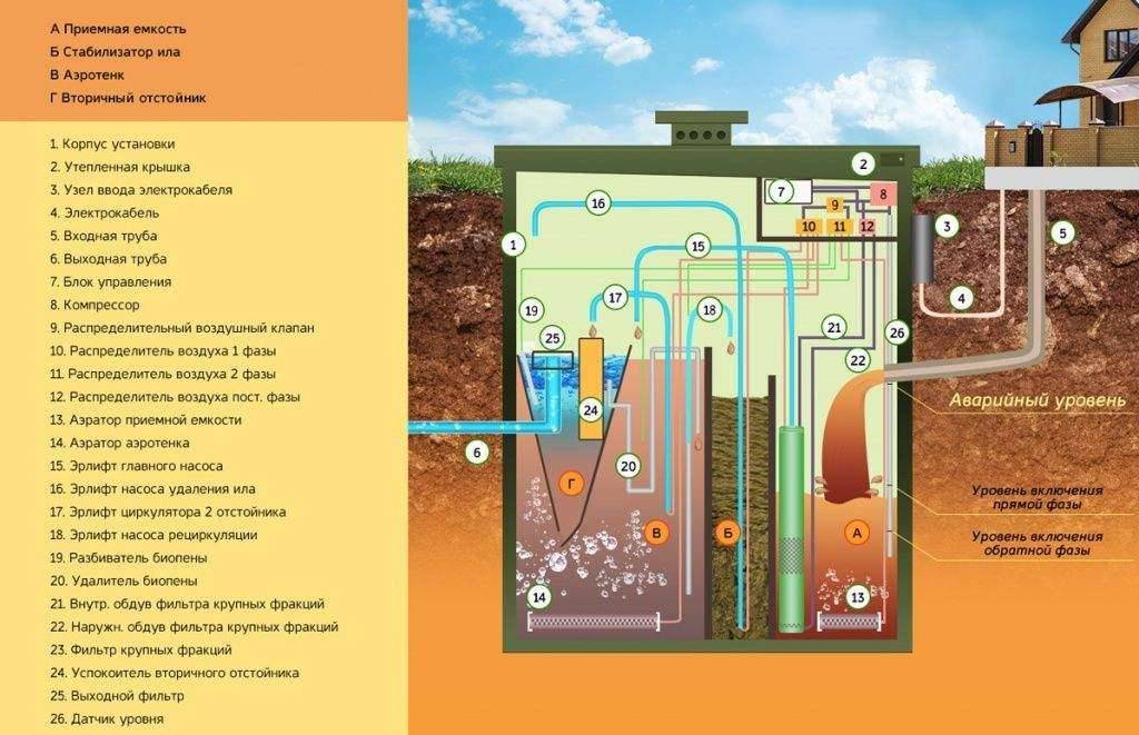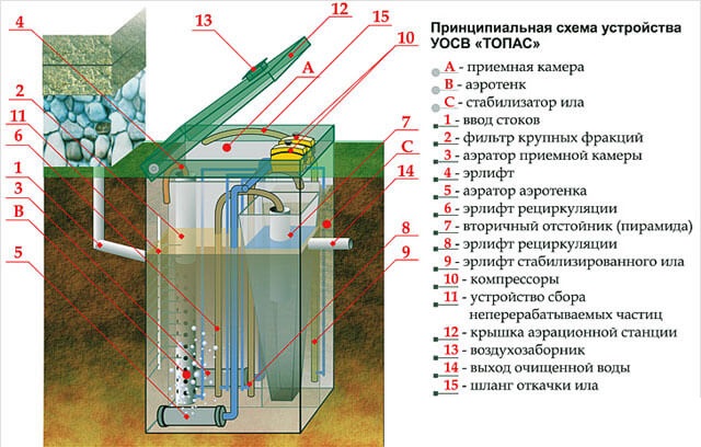 Sur le schéma du dispositif de fosse septique aérobie, on voit que toutes les sections de la station d'épuration sont reliées entre elles par des tuyaux. Airlift est un type de pompe à tuyau qui transporte l'eau purifiée, les boues et autres impuretés d'un compartiment à l'autre.