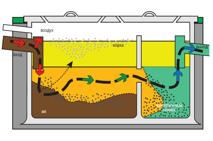 Étape 1. Nettoyage primaire. Les eaux usées s'écoulent dans le premier réservoir ou compartiment par le tuyau d'égout de la maison. Voici un nettoyage grossier des grosses particules en suspension. Des suspensions lourdes (grains de sable et inclusions insolubles similaires de drains) se déposent au fond de la chambre. Des fractions légères (graisses et huiles) remontent à la surface et s'écoulent dans le compartiment suivant.