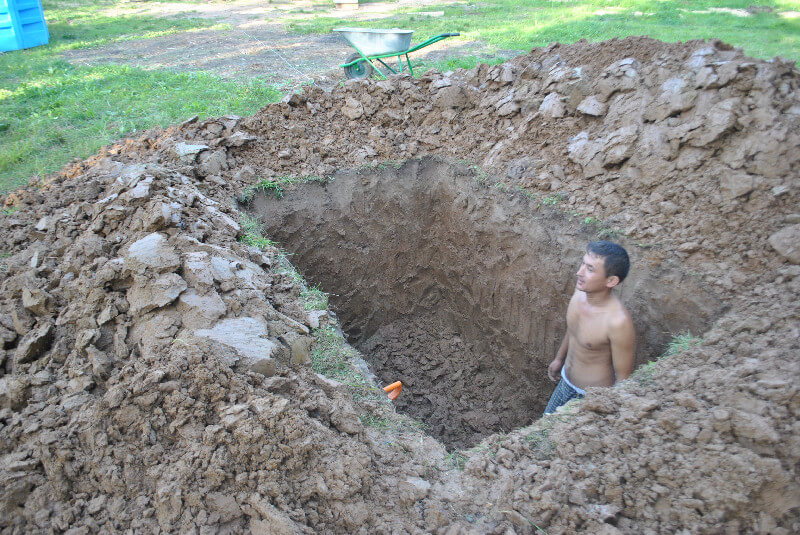 Un calcul un peu différent de la profondeur de la fosse sans fond. Fosse d'excavation avec une perforation plus profonde que l'analogue scellé en raison de l'installation d'un filtre à sable et à gravier. Afin de ne pas se tromper avec les calculs, il suffit d'ajouter l'épaisseur du tampon filtrant à la hauteur de la structure.