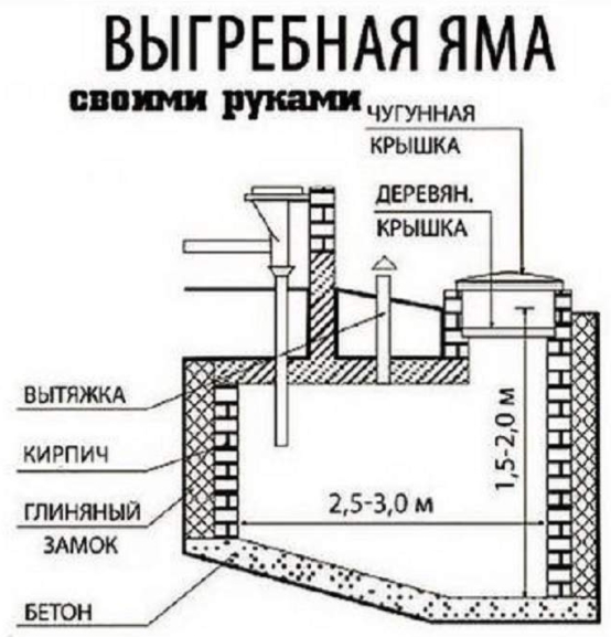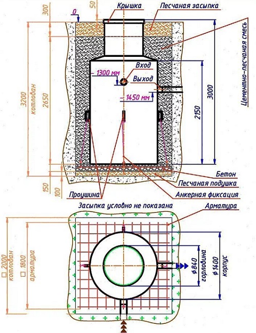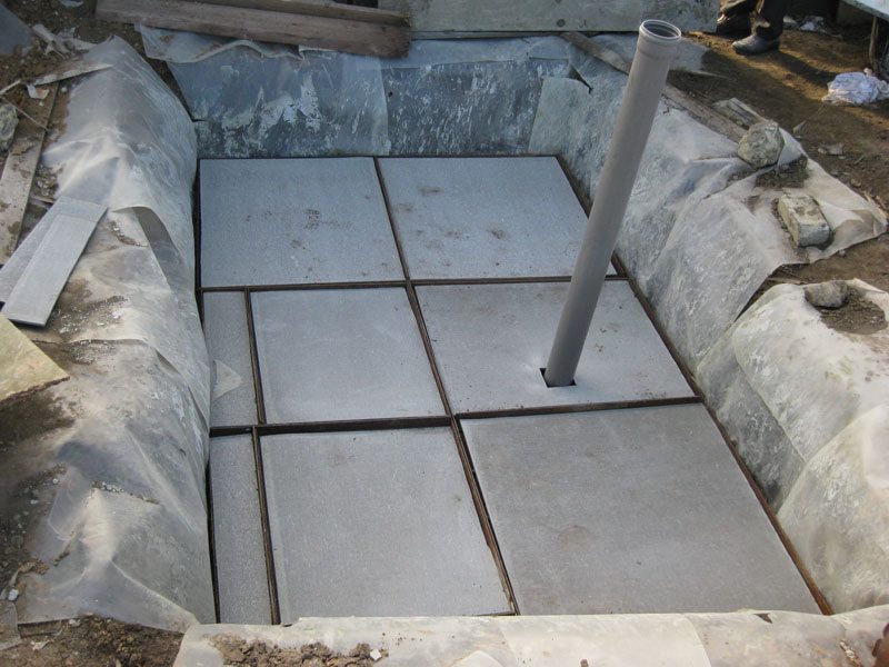Le fond de la fosse est équipé de façon traditionnelle pour tous les entraînements: ils posent une dalle de béton ou font une chape de ciment. Dans la partie supérieure, un revêtement de sol est généralement constitué de panneaux solides et un trou avec un couvercle est laissé pour l'entretien - pompage des eaux usées.