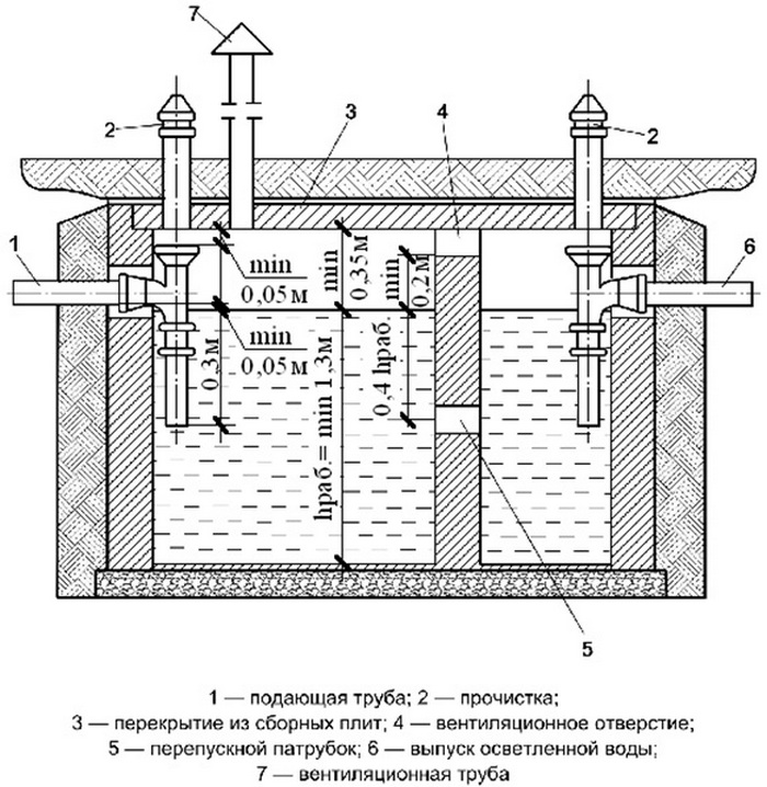 Souvent, lors de la construction de la fosse septique la plus simple, un schéma plus complexe de deux chambres est utilisé. En termes simples, approximativement au centre de la structure, une cloison en béton est installée avec un trou de trop-plein.
