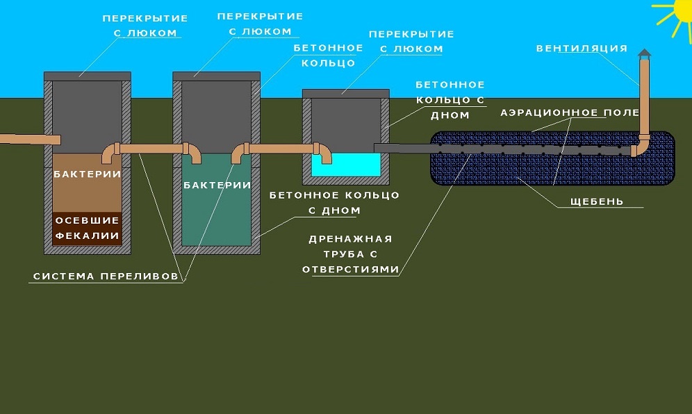 Avec une augmentation du nombre de puits de débordement, le schéma est un peu plus compliqué. Cependant, cela augmente la période entre la réception des déchets dans le réservoir et le mouvement du composant liquide dans le sol. Cela améliore la qualité du traitement des eaux usées et les rend plus sûres pour l'environnement.
