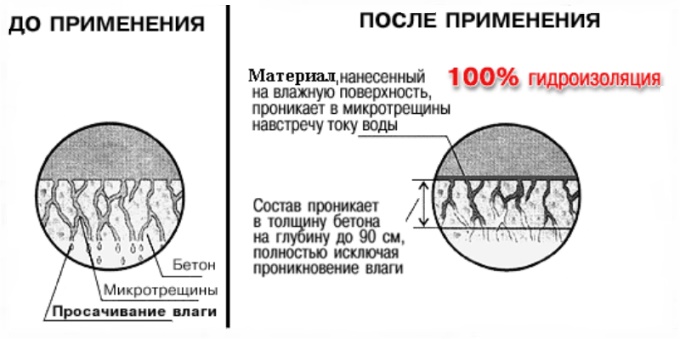 L'imperméabilisation doit être appliquée avec une éponge ou une brosse avec une brosse rigide. Le temps de séchage de la composition est de trois jours. En même temps, pendant le processus de séchage, il est nécessaire d'humidifier la surface afin d'éviter les fissures, et par temps chaud, il est nécessaire d'hydrater toutes les 3-4 heures.