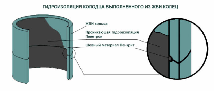 Au lieu du mastic de bitume, des composés d'étanchéité spécialisés peuvent être utilisés. L'imperméabilisation est appliquée sur la surface intérieure du puits. Les additifs augmentent les propriétés d'étanchéité de la solution à la composition du mortier de maçonnerie.