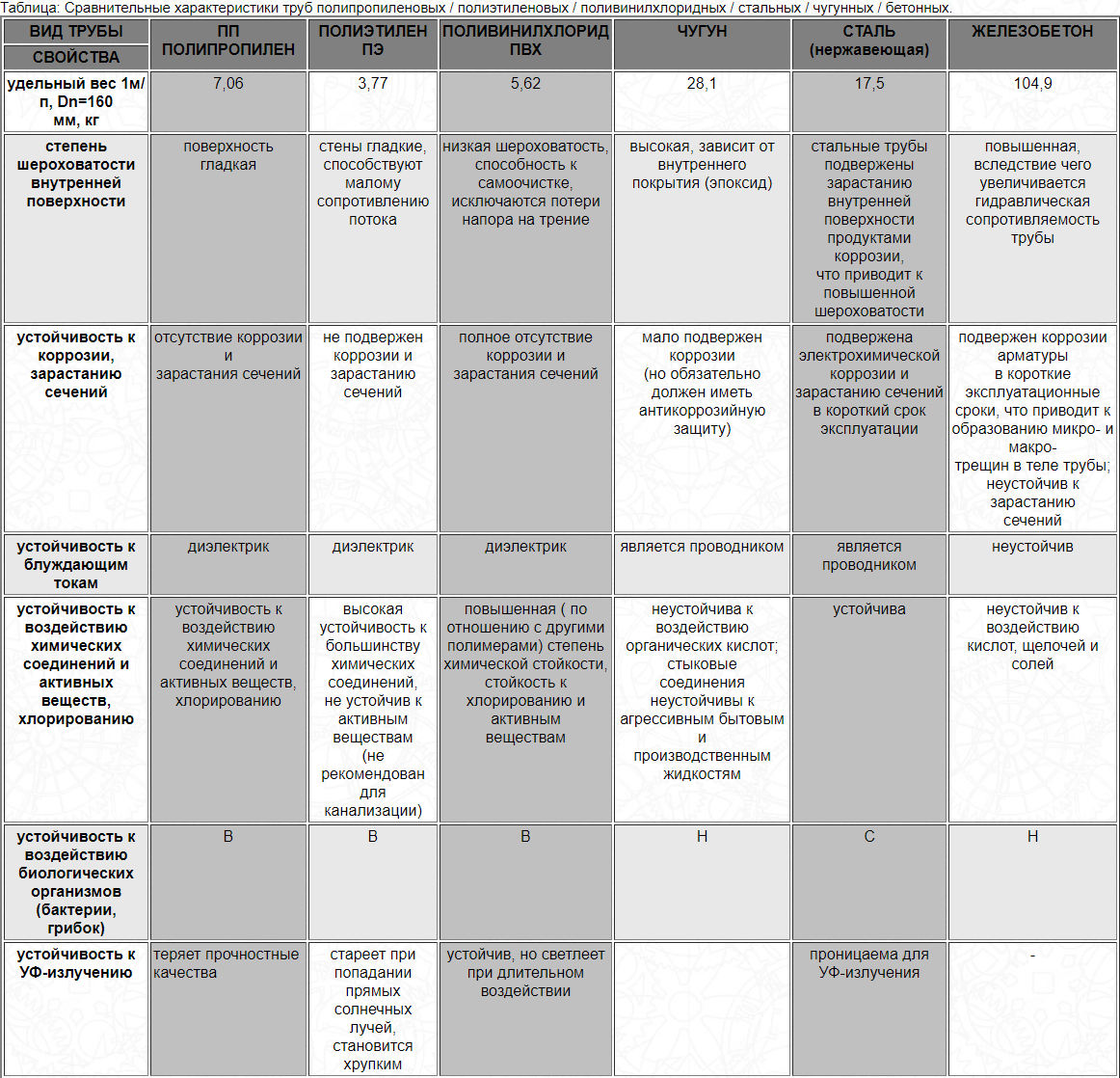 Je joins un tableau avec les caractéristiques comparatives des tuyaux de différents matériaux. Résistance aux effets des organismes biologiques ci-dessous (B-élevé, C-moyen, H-bas).