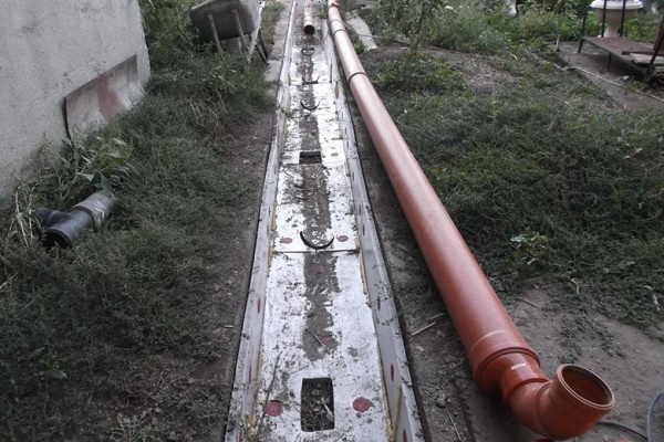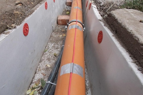 Les tranchées avec des tuyaux d'égout sont d'abord recouvertes de sable jusqu'à une hauteur d'environ 0,2 m, puis de terre. Dans les régions aux hivers très froids, l'isolation thermique sous forme de coques en polystyrène expansé est complétée par un câble isolant, le plaçant sous la coque.