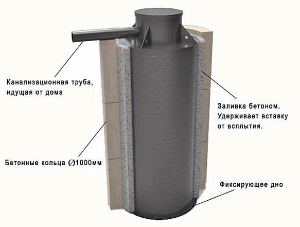 Avant l'immersion de l'insert dans le fût d'une fosse septique en béton, des trous sont percés exactement dans le contour des lignes de communication connectées pour entrer et sortir des tuyaux d'égout dans les parois du logement. Les passages sont scellés ou échaudés autour du périmètre. L'écart entre l'insert et les parois en béton de la fosse septique est rempli de béton.
