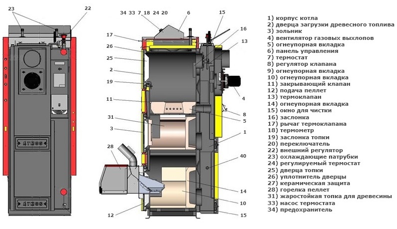 La caractéristique structurelle la plus importante des chaudières de chauffage combiné à granulés est l'équipement de plusieurs chambres de combustion, adaptées pour utiliser l'un des types de combustible - solide ou liquide.