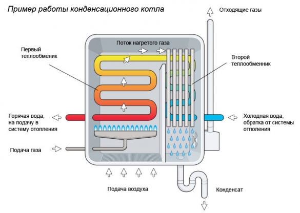 La haute efficacité du générateur de chaleur à gaz à condensation est assurée par la présence d'un échangeur de chaleur supplémentaire dans sa conception. La première unité d'échange de chaleur, standard pour toutes les chaudières de chauffage, transfère l'énergie du combustible brûlé au caloporteur. Et le second ajoute également à cela la chaleur de la récupération des gaz d'échappement.