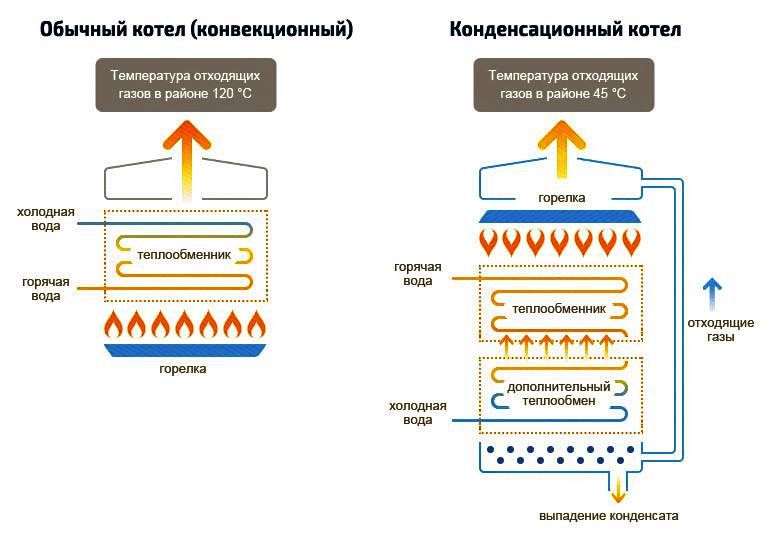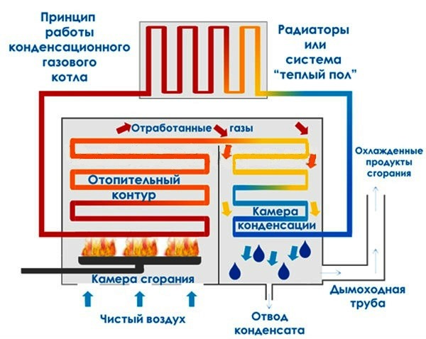 Dans une chaudière à convection, les produits de combustion de gaz naturel CO2, les oxydes d'azote et la vapeur ne sont refroidis qu'à 140–160 0C. Si vous les refroidissez plus bas, le courant d'air tombera dans la cheminée, du condensat agressif commencera à se former et le brûleur s'éteindra.