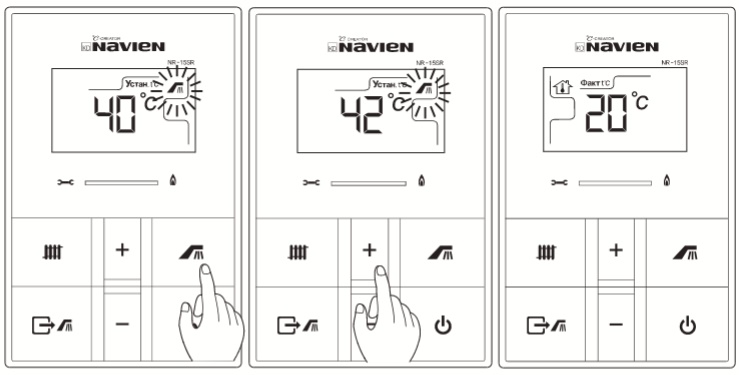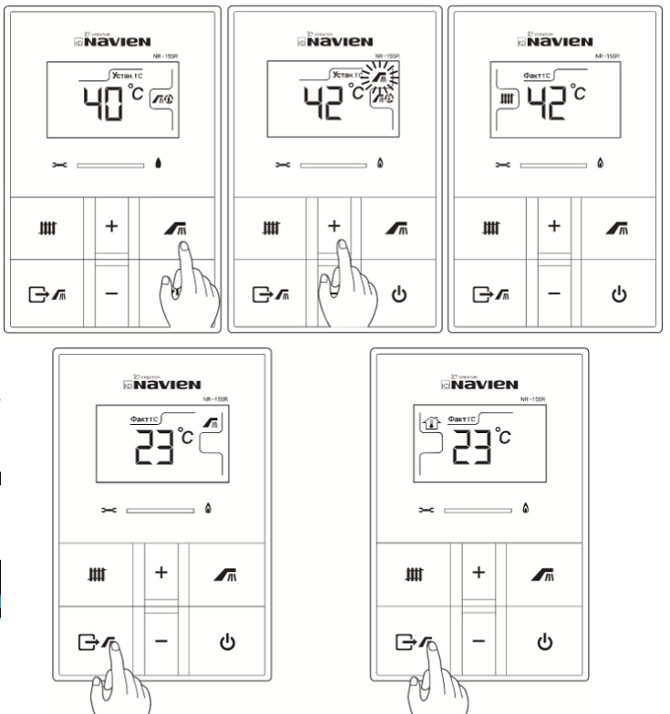 Vous pouvez transférer la chaudière Navien dans un mode qui consiste uniquement à chauffer l'eau, en utilisant une autre fonction. Il est connu de nos compatriotes sous le nom d'hiver-été. Cependant, il est juste de l’appeler «Out of Home». Le bouton pour sa sélection est situé dans le coin inférieur gauche.